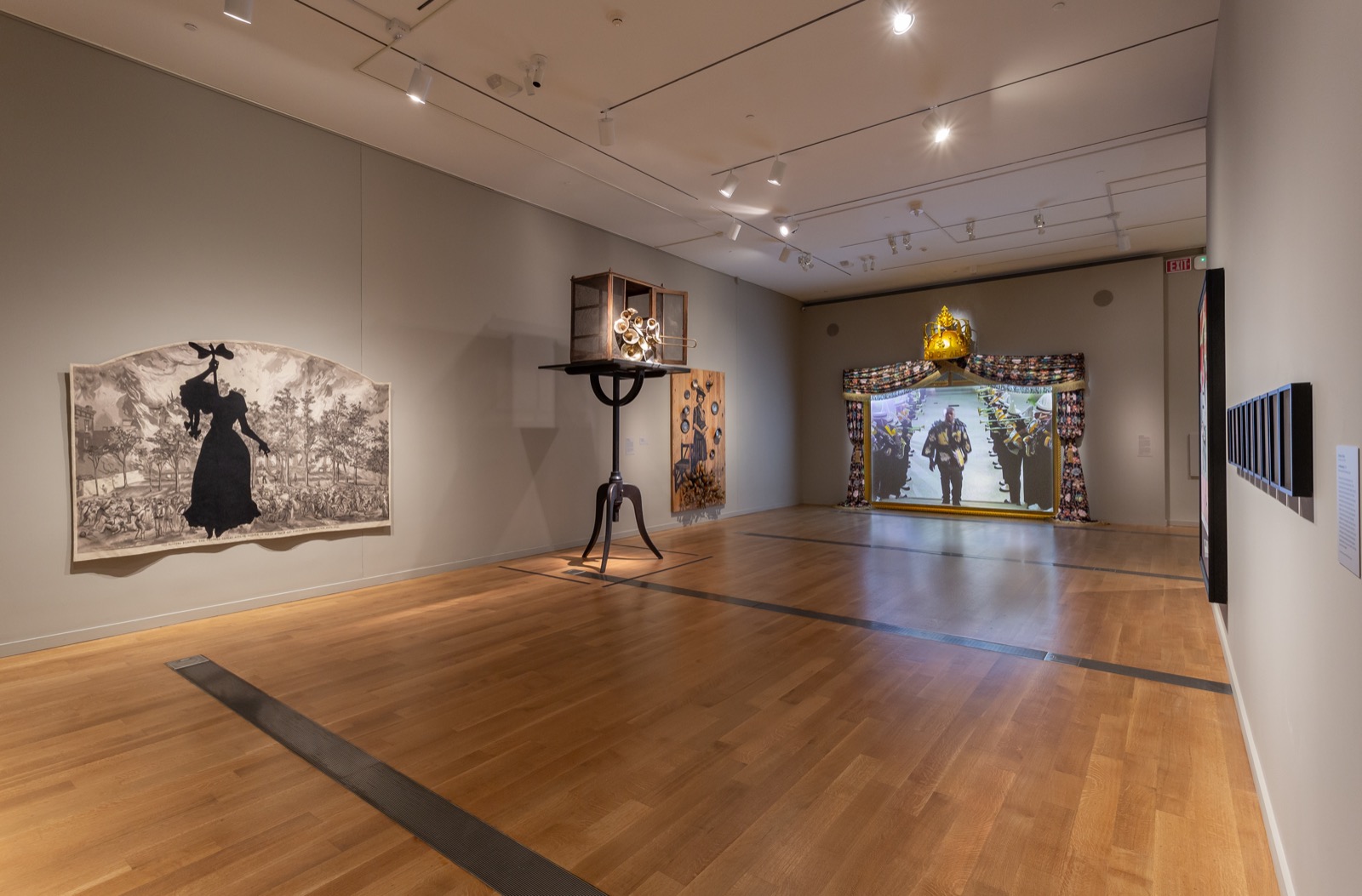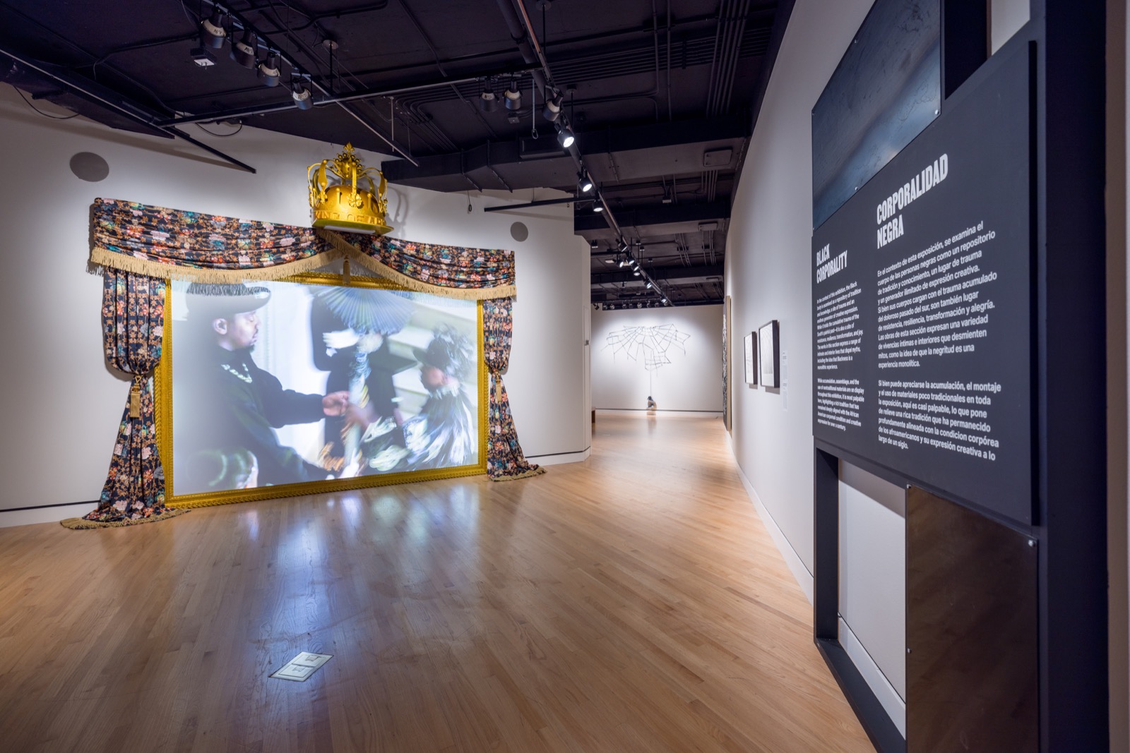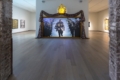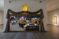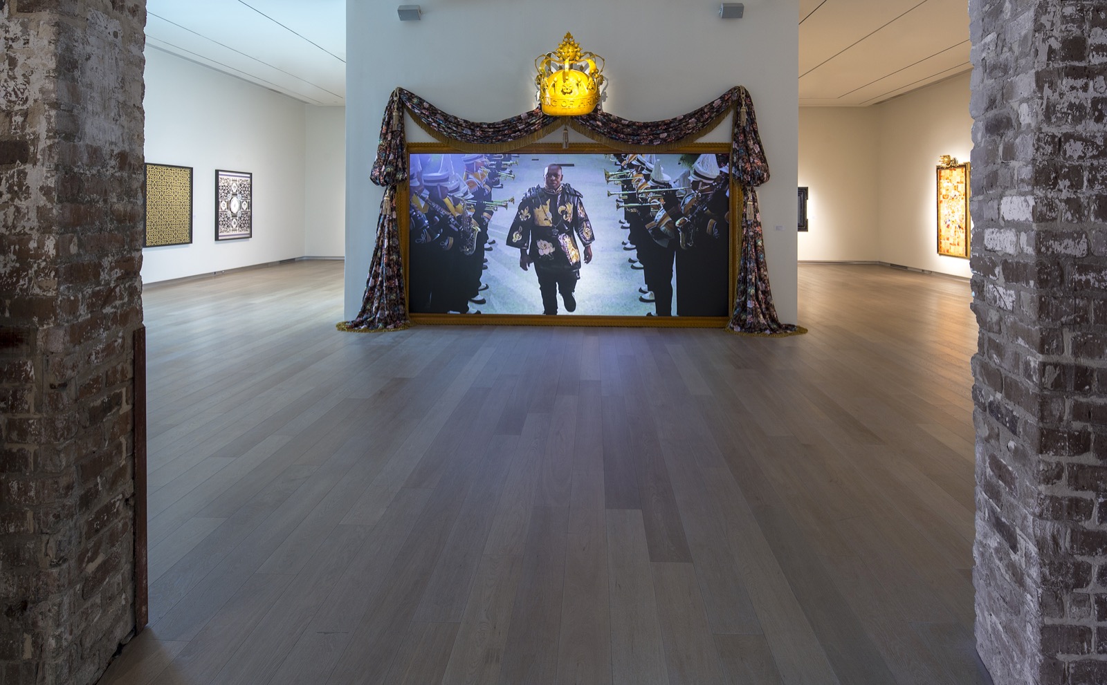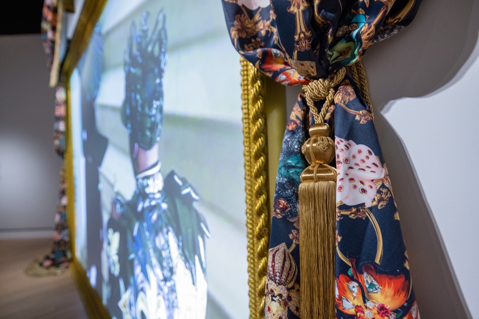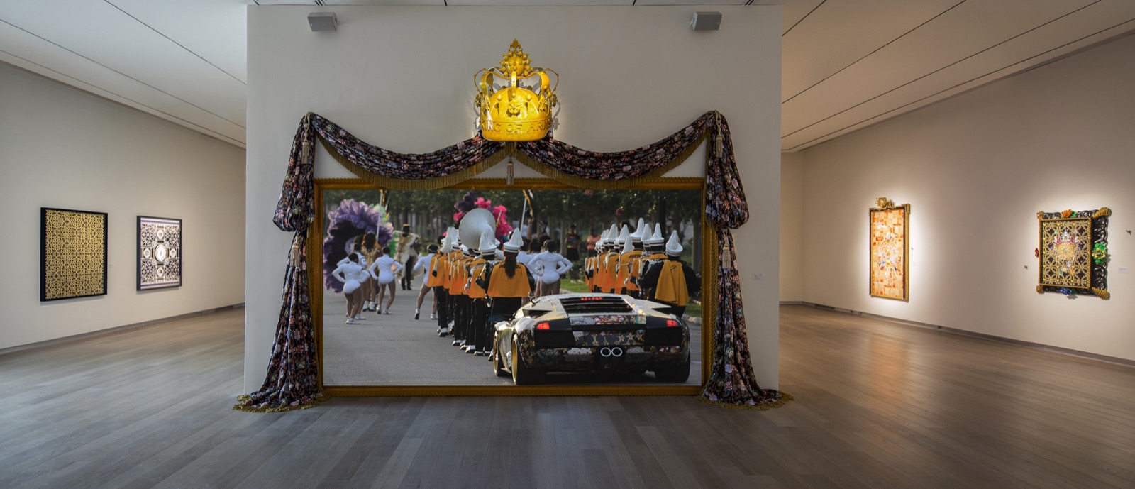 Single-channel video installation with sound, custom artist frame and hand carved crown sculpture with automotive paint, artist textile and HD rear projection screen